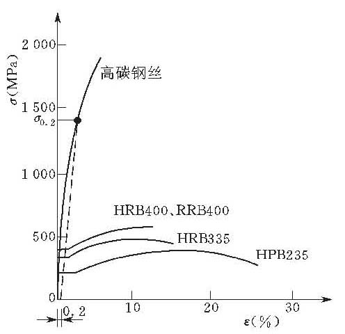普通钢筋是指用于钢筋混凝土结构中的钢筋和预应力混凝土结构中的非预应力钢筋。普通钢筋宜采用HRB400级和HRB335级钢筋,也可采用HPB235级和RRB400级钢筋。钢筋的直径在6~50 mm之间。直径小于5 mm的称为钢丝。预应力混凝土结构中的预应力钢筋宜采用预应力钢绞线、钢丝,也可采用热处理钢筋。其中预应力钢丝包括三面刻痕钢丝、螺旋肋钢丝和光面并经消除应力的高强度圆形钢丝。 对具有屈服台阶的钢筋,都取它的屈服强度作为强度指标;对无屈服台阶的高强钢丝,则常取对应于0.2%残余应变的应力(σ0.2)作为协定屈服强度(见图)。钢筋的强度标准值应具有不小于95%的保证率,结构设计时的钢筋设计强度则由标准强度再除以材料性能分项系数而得(参见材料设计强度)。 除了上述柔性钢筋以外,还有用型钢来配筋的,称为劲性钢筋,它在浇筑混凝土时可直接承重,故能节省支架、加快施工,但用钢量会增加。