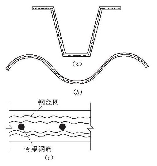 钢丝网水泥板的截面形状 (a)五折板;(b)波形板;(c)钢丝网水泥剖面