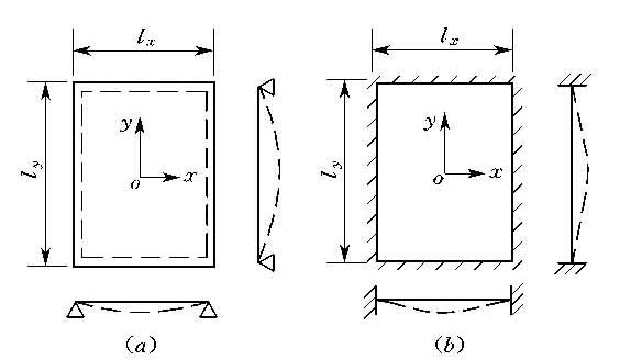 图1 四边支撑板 (a)四边简支;(b)四边固定 ly—板的长边尺寸;lx—板的短边尺寸