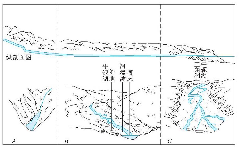 河流地貌特征鸟瞰图 A—上游段;B—中游段;C—下游段
