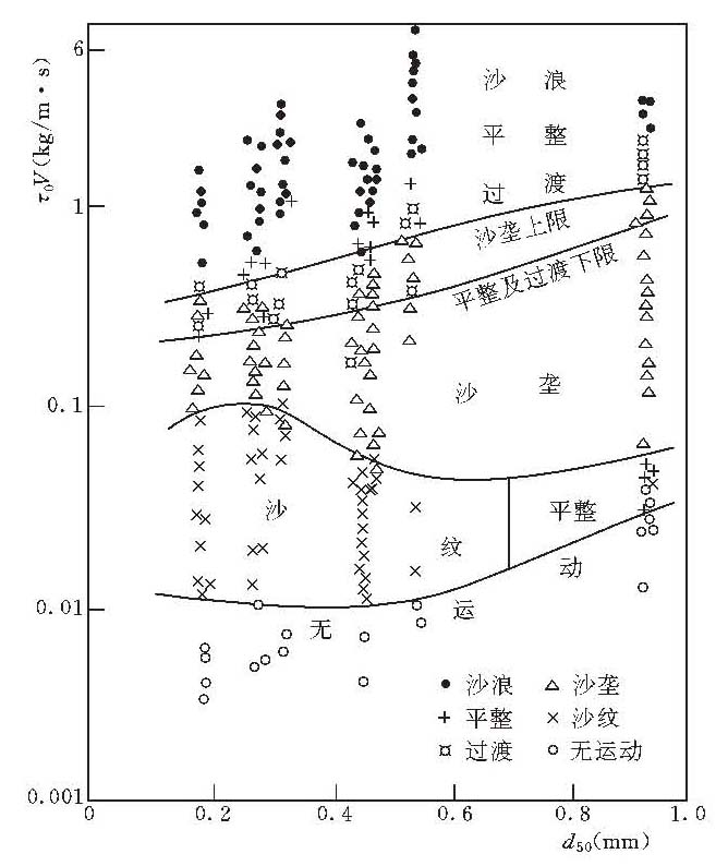 用以判别河道可能出现的床面形态的标准。 在一定水流和床沙组成情况下,沙质河床会出现特定的床面形态,如沙纹、沙垄、沙浪等。因此,可以根据给定的水沙条件来预测可能出现的床面形态。由于沙波形成理论尚不成熟,通常采用经验关系来判别各种沙波形态的水沙条件。在点绘经验关系的时候,不同的研究者选用了不同的水流、泥沙特征参数,采用不同的实验资料。阿仁(J.Alen)用水流的功率τ0V(τ0为水流切应力,V为平均流速)为纵坐标,以泥沙粒径(d50)为横坐标点绘经验关系,根据他们的天然资料及水槽试验资料得到床面形态判别关系如图。