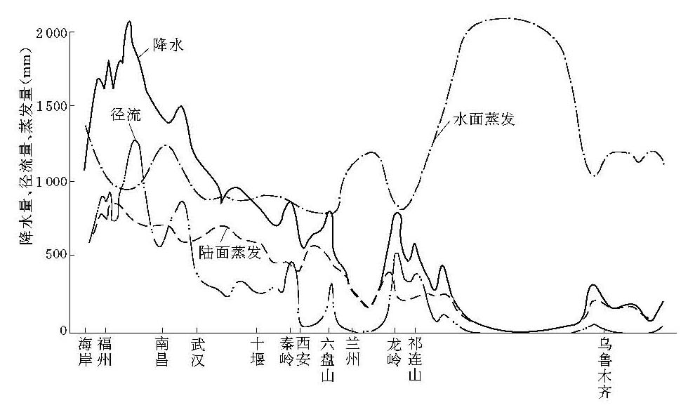 中国东南至西北年水量平衡要素剖面图