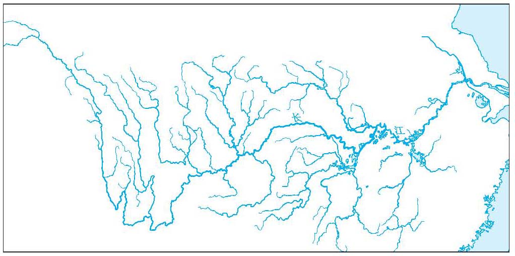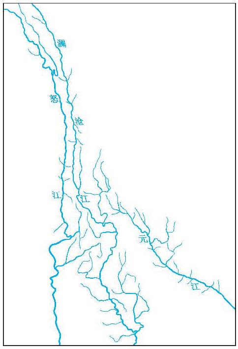 (6)混合状水系。由两种以上不同水系形状组合而成的水系。长江水系呈混合状(图6)。 水系的特征值包括:①河长,河流由河源至河口的中泓长度,是确定河流落差和比降,估算水能和航程,决定汇流时间等的重要参数。②河网密度,又称河道密度,即干支流总河长与流域面积之比值。③河网发展系数,又称河道发展系数,即某级支流的总河长与干流河长之比,发展系数越大,表明支流长度超过干流长度越多,河网对径流的调节作用也就愈大。④水系不均匀系数,干流的一岸支流总长与另一岸支流总长之比,表示整个水系两岸不对称的程度和两岸注入干流水量的不均衡性质。⑤河流弯曲系数,干流河源至河口两端点间的河长与其直线距离之比,表示河流平面形状的弯曲程度,是研究河流水力特征和河床演变的一个重要指标,取决于流域中的地形、地质、土壤性质和水流特性等。⑥分汊系数,干流下游自开始有分流汊河起,各分流汊河和干流的总河长与开始有分流汊河以下干流河长之比。分岔系数愈大,表示该河分汊河愈多,水流愈分散,流速减小,泥沙愈易淤积,河床愈不稳定。