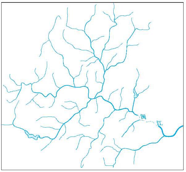 (5)格状水系。各支流大致垂直汇入干流,干支流的分布呈格子状,干流出口断面的流量过程较平缓。闽江水系呈格状(图5)。