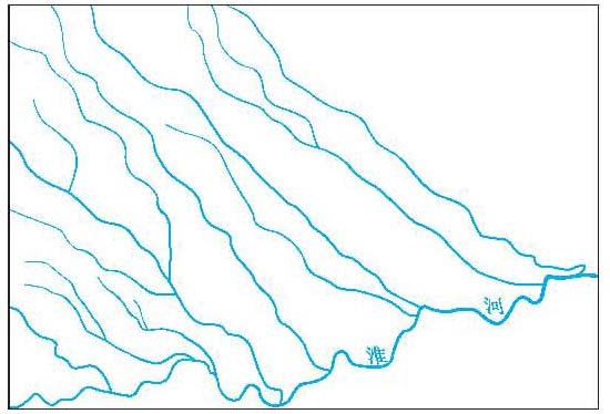 (2)扇状水系。主要支流均在较短河段内汇入干流,形同一把扇子。汛期,支流洪水集中较快,干流常易发生峰高量大的洪水。海河水系呈扇状(图2)。 (3)羽状水系。一个狭长的流域中各支流大体平行分布于干流两岸,如同一根羽毛。这种水系干流各河段的水量一般变化较平缓。中国境内的元江、澜沧江和怒江水系呈羽状(图3)。 (4)平行状水系。各支流间相互平行先后汇入干流,或者其中有的支流与干流先平行流向下游,然后在下游与干流相汇合。这种水系的来水,随降雨的地区分布而异,如遇全流域降雨,各支流来水若能先后错开,则干流出口断面的流量过程较平缓;如降雨中心由上游向下游移动,则常易形成较大洪水。淮河水系呈平行状(图4)。