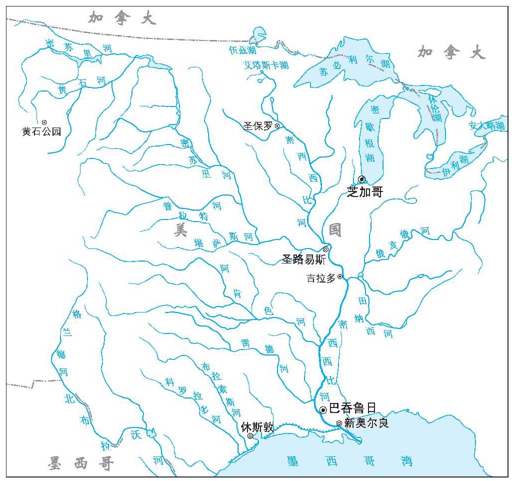 北美洲最大河流。干流发源于美国北部的艾塔斯卡湖,南流经美国中部平原,注入墨西哥湾,河长3 950km。若自最大支流密苏里河源头算起,则全河长6 262km,仅次于非洲的尼罗河、南美洲的亚马孙河和中国的长江,为世界第4长河。密西西比河干支流涉及阿巴拉契亚山脉以西、落基山脉以东和北部冰碛湖沼区以南的美国31个州及加拿大的阿尔伯达省和萨斯喀彻温省(见图),流域面积322.1万km2,约占北美洲总面积的1/8、美国本土面积的2/5,流域面积仅小于亚马孙河、刚果河,居世界大河的第三位。河口年平均流量19000m3/s,年入海水量5 700亿m3,年入海泥沙量4.95亿t。
