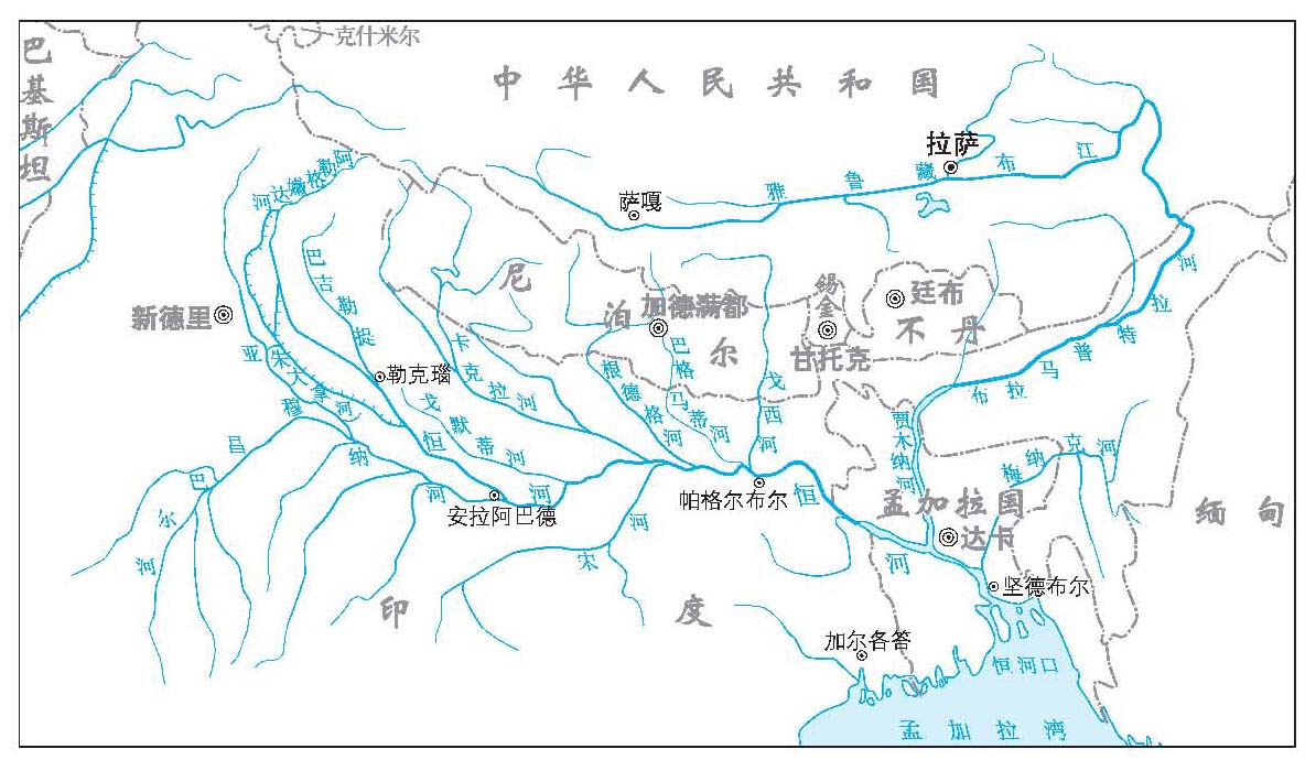 流经印度、孟加拉国的南亚大河。一些支流发源于尼泊尔和中国。上源为巴吉勒提(Bhagirathi)河和阿勒格嫩达(Alaknada)河。均发源于喜马拉雅山脉西段南坡,东南流至卡瑙季(Kanauj)附近汇合后称恒河。再东南流,先后接纳右岸的亚穆纳河(朱木拿河)、宋河等支流,左岸的戈默蒂河、卡克拉河、根德格河、巴格马蒂河、戈西河等支流,干流穿过西瓦利克山脉后,在赫尔德瓦尔附近流入印度着名的恒河平原地区。经印度帕格尔布尔后,进入孟加拉国,在戈阿隆多(Goelundo)与布拉马普特拉河(下游称贾木纳河)汇合,在坚德布尔与来自左岸的梅纳克河汇合,然后通过三个汊口注入孟加拉湾(见图)。恒河全长2 580km,流域面积105万km2。恒河法拉卡闸以上多年平均径流量5 500亿m3,年平均输沙量4.8亿t。