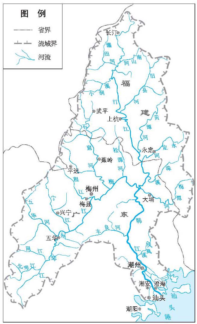 中国东南沿海重要河流之一。古称员江、恶溪,后称鳄溪,因韩愈着有《祭鳄鱼》文而得名。韩江流域范围涉及广东、福建、江西3省22个市、县,流域面积30 112km2,三省占流域面积分别为59.3%、40.1%、0.6%。 流域地势由西北和东北向东南倾斜,分水岭大部分海拔为1000~1 500m的高山。北部以武夷山与赣江分界,西部和东北部以台地与东江和九龙溪分界,东部以玳瑁山、博平岭、凤凰山分别与独流入海的九龙江和黄岗河分界,西南部以莲花山与榕江分界,干流向南流入南海。流域内山地占流域总面积的70%,多分布在流域北部、中部,一般在海拔500m以上;丘陵占流域总面积的25%,多分布在干支流谷地,一般在海拔200m以下;平原占流域总面积的5%,主要分布在韩江下游三角洲,一般在海拔20m以下。 韩江上游由梅江和汀江汇合而成,梅江为主流,发源于广东省紫金县上嶂,河长307km, 流域面积13 929km2,由西南向东北流经广东省的五华、兴宁、梅县、梅州和大埔等市、县,在三河坝与汀江汇合;汀江发源于福建省宁化县的赖家山,河长323km,流域面积11 802km2,由北向南流经福建省的长汀、武平、上杭、永定等县和广东省的大埔县。梅、汀两江汇合后称韩江,由北向南流经广东省的丰顺、潮安等县,至潮州市进入韩江三角洲河网区,分东、西、北溪流经澄海、汕头等市注入南海(见图)。其他主要支流有五华河、宁江、石窑河、旧县河、黄潭河、永定河、梅潭河等。以梅江为源头,干流总长470km。