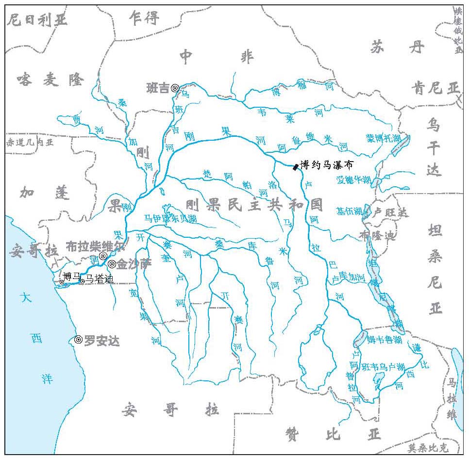 位于非洲的世界大河之一。发源于赞比亚北部高原,称谦比西河,西南流经班韦乌卢湖沼泽地带后北流,称卢阿普拉河,为赞比亚与刚果民主共和国的界河,流入姆韦鲁湖后转向西北流,入刚果民主共和国境内汇入卢阿拉巴河,经博约马瀑布后进入中游,始称刚果河。干流继续向西北流,后又转向西南流,河道呈弧形,流过地势比较低洼的刚果盆地北部及西部边缘地带,沿途有大片沼泽。自开赛河入口以下进入峡谷山区,在金沙萨以下为下游,切穿晶山山脉形成一系列峡谷、急滩和瀑布,组成世界着名的利文斯敦瀑布群,于博马附近注入大西洋(见图)。河口处年径流量41 300 m3/s,年入大西洋水量为13 026亿m3。刚果河河口没有三角洲,只有较深的溺谷,河面宽数公里,水深100 ~200 m,河槽向大西洋底延伸达150 km,在河口以外数十公里范围内,形成广大的淡水洋面。这是非洲大河中唯一的深水河口,有利于航运的发展。