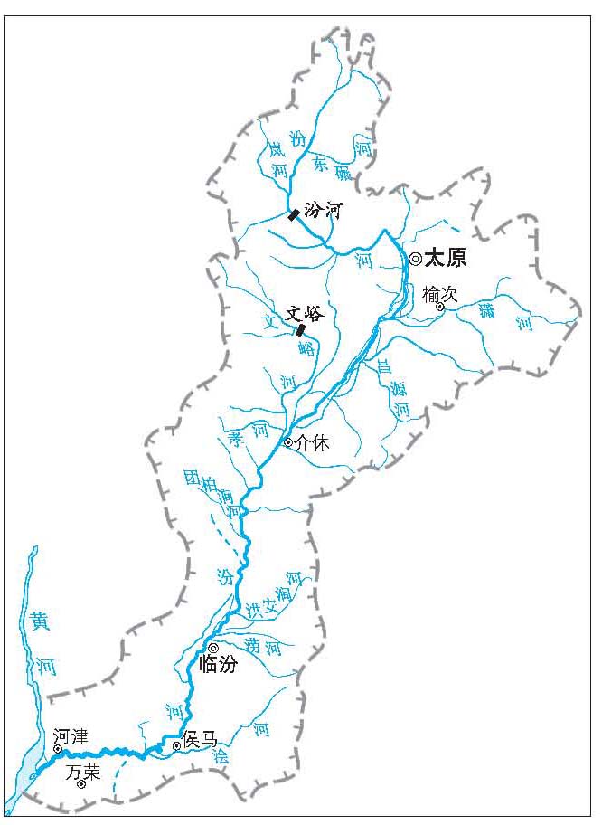 中国黄河第二大支流,山西省境内第一大河。汾河发源于晋西北的管涔山,流经静乐、太原、临汾三盆地,至河津县汇入黄河(见图)。流域面积39 471 km2,全长695 km,全部位于山西省境内,占山西省总面积的25.3%。汾河流域东以五台山、太行山支脉太岳山与海河水系为邻,西以吕梁山与黄河北干流及入黄支流相隔,南以孤山、稷山与黄河支流涑水河为界。